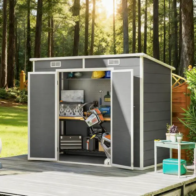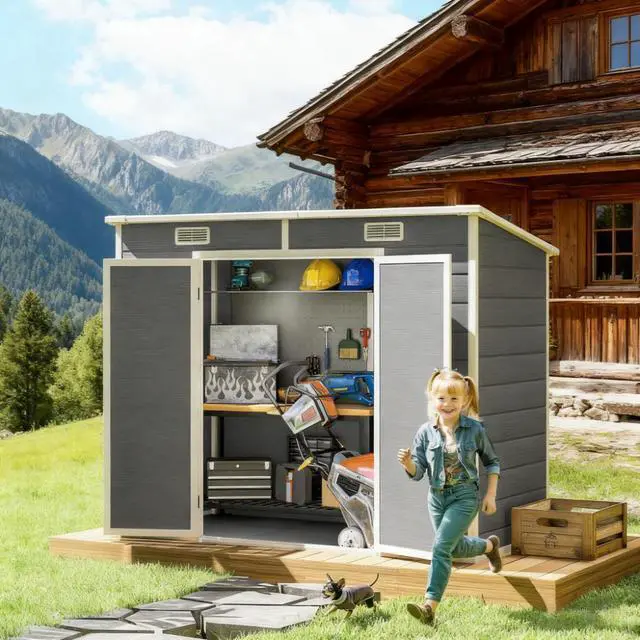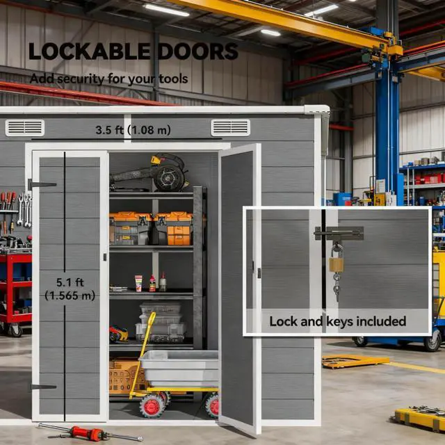 Secure Access: Equipped with double-hinged doors for easy entry and exit, this tool shed includes a latch and lock for added security to keep your items safe