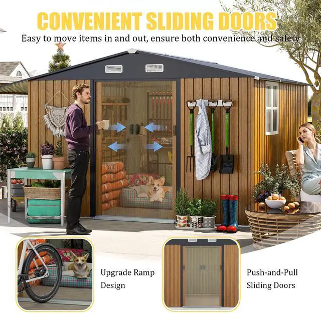 smooth Sliding Doors & Ramp: This garden shed features smooth-sliding doors with an integrated ramp, making it effortless to move heavy or wheeled items such as lawnmowers, generators, or wheelbarrows in and out