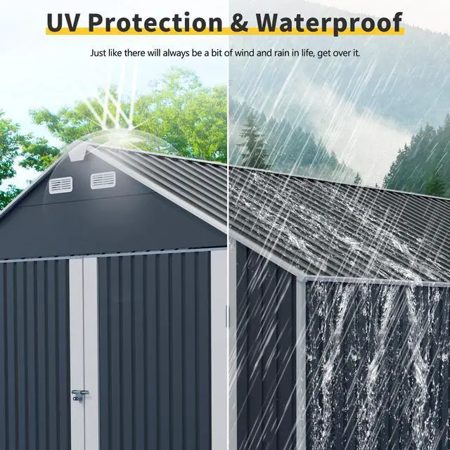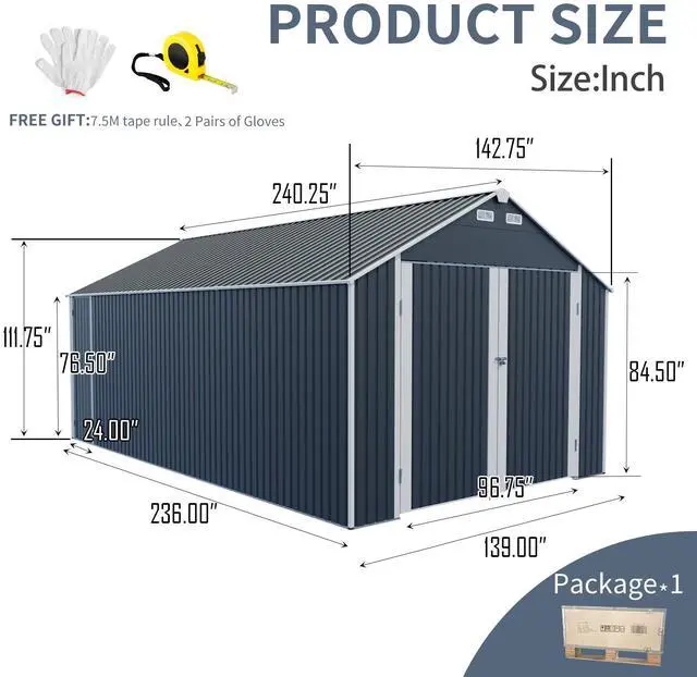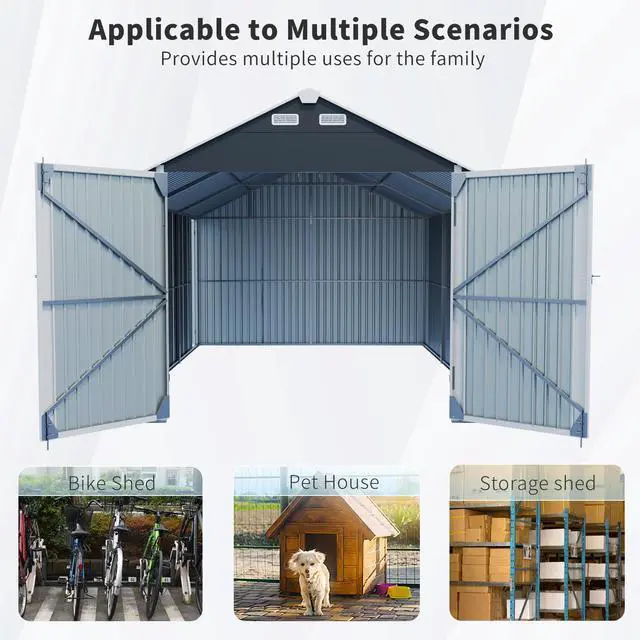 Industrial-Grade Durability Constructed with heavy-duty galvanized steel and a rust-resistant coating to combat corrosion, wind, snow, and rain. Reinforced roof panels and walls ensure resistance to wind, rain, and snow.