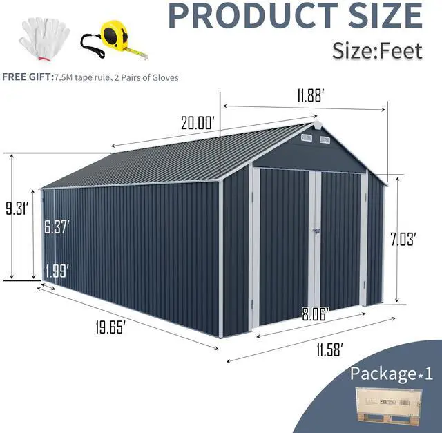 Extra Spacious Shed: Compared to traditional storage sheds available in the market, the 12 x 20 FT outdoor shed provides a larger area for your truck car, large size tools, lawn equipment and bicycles to store.