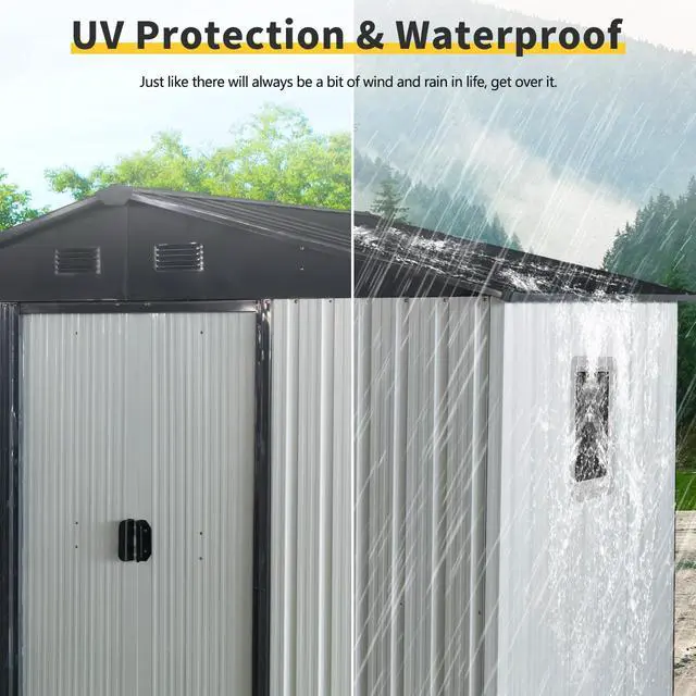Durable & Stable Storage Shed: This shed utilizes galvanized iron frame which greatly increase the overall sturdiness. On top of that, the galvanized steel panels, coated with eco-friendly painting, can endure harsh weather for at least 6 years.