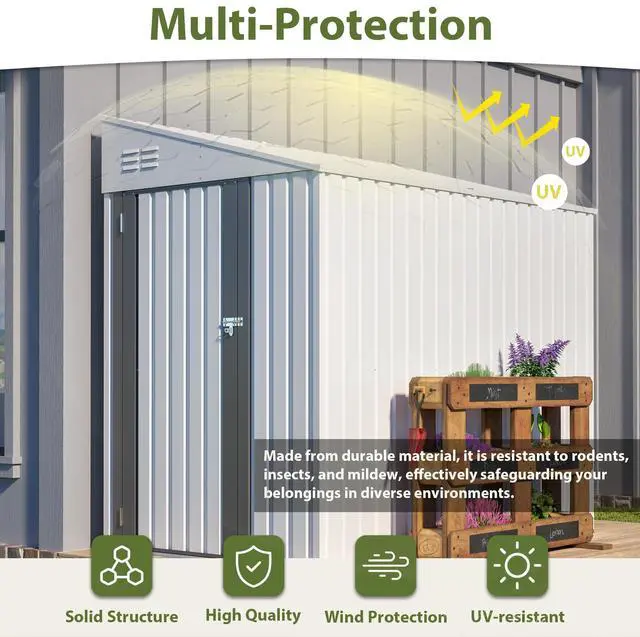 1. Durable White Galvanized Steel ConstructionCrafted from premium galvanized steel sheets with a clean white finish, this shed offers exceptional resistance to corrosion, rust, and wind. Built to withstand harsh weather and daily use, it features a robust structure rated for wind speeds up to 70 mphensuring long-lasting protection for your outdoor equipment.