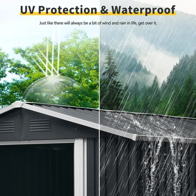 [Gift Tool] Metal Foundation Frame, Anchors, Hooks, Shelf, Lock (padlock), Gloves Easy-build shed made of Electro Galvanized Steel treated for strong corrosion resistance. UV resistant steel panels protect against rot, insects, and extreme weather conditions.