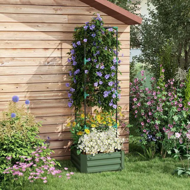 • Galvanized Raised Garden Bed, 24" x 24" x 11.75" Outdoor Planter Box with Trellis Tomato Cage and Open Bottom for Climbing Vines, Vegetables, Flowers in Backyard, Garden, Patio, Green