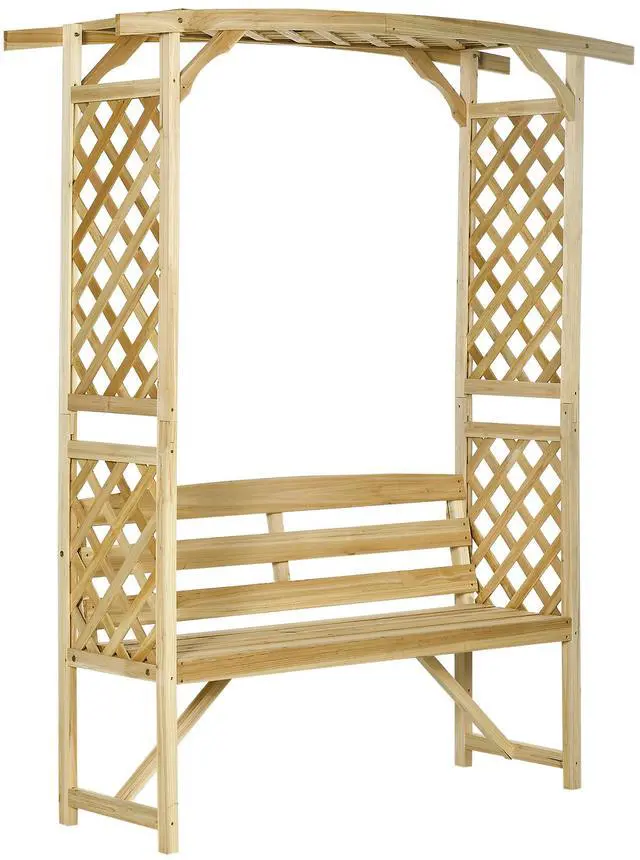 it also features a trellis on each side and a pergola on the top, combining to form a large garden arbor arch. Supporting up to 528 lbs. of weight, it brings form and function to your garden. Save Space & Sit Down: Typical plant support takes up space. The two trellises and pergola top of our arbor bench offer you a place to grow grape vines, eye-catching ivy, mesmerizing morning glory, sweet potatoes, and so much more without sacrificing space or style. Great to Decorate: Do you know what else our arbor arch works wonders for? It's a great place to decorate no matter your reason to celebrate. String it up with lights, tie on balloons, or frame it with fabric. Christmas, Easter, Halloween, weddings, BBQ cookouts, or graduation parties in the garden, no matter the reason to decorate, this is the canvas you use to create. Outdoor Ready Material: Made of solid fir wood that's been coated with a waterproofing varnish, our porch bench arbor arch is outdoor-ready. The varnish brings out the beauty of the natural woodgrain, and with a wipe-clean finish, it also makes it very easy to maintain. Everything you need comes in the convenient kit with a manual telling you step-by-step how to make it. Patio Bench Info: Overall Dimensions: 63" W x 19.75" D x 78" H, Weight Capacity: 528 lbs. Assembly required.