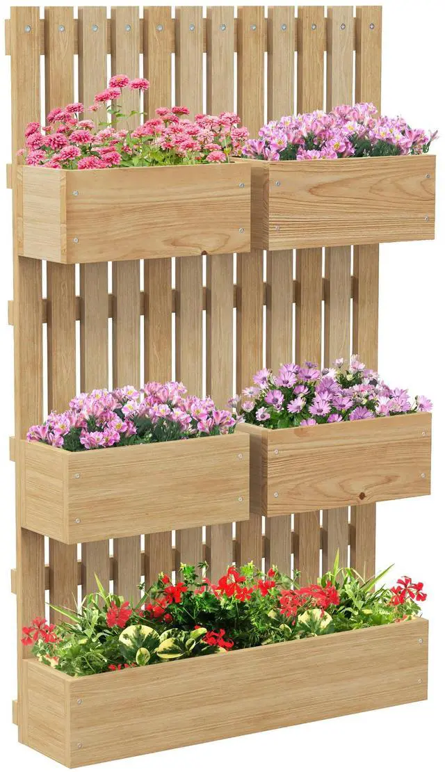 Trellis: Vines and other climbing plants can crawl to the top with aid from wooden slats. With a cute, fence-like look featuring five boxes, our raised planter bed set features a trellis wall to hold it all together.