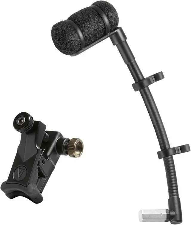 The rugged, metal clip-on mount features rubber-lined clamping jaws with a locking screw that allow the mount to be safely and securely attached to an instrument or other surface. The strong, flexible gooseneck, which is held securely in the mount's socket by a locking screw, lets you position the mic where you want it and holds it there, no matter how much you move your instrument as you play.