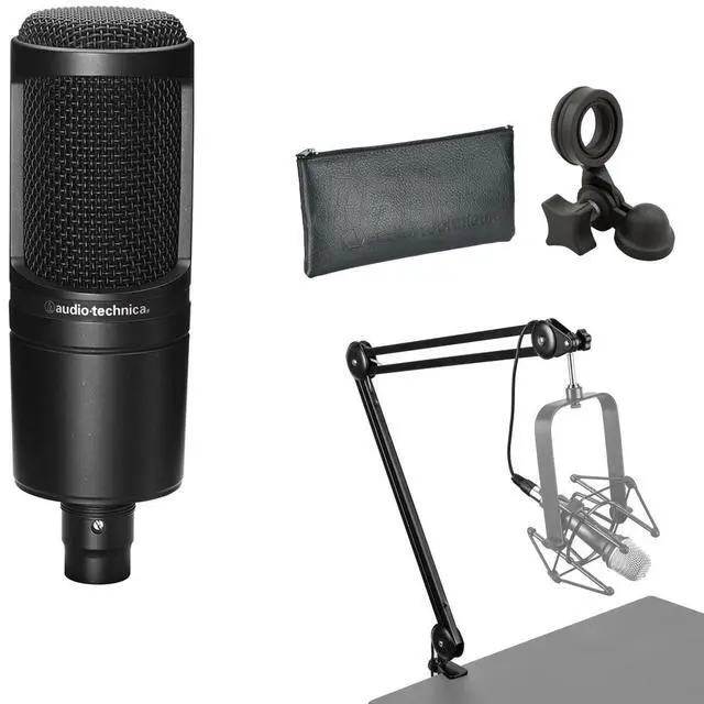 Included with the microphone is a robust broadcast arm, complete with internal springs for fluid and silent positioning. The integrated 10' XLR cable ensures a secure and quality connection to your recording equipment, allowing for seamless integration into your audio setup. The pivoting, threaded stand mount that comes with the AT2020 allows for precise and stable microphone placement, ensuring that you can angle the microphone perfectly for every session. In summary, the AT2020 bundle is a versatile, durable, and reliable solution for anyone seeking professional-grade audio capture. Its high-quality construction, combined with its ability to produce clear, detailed recordings, makes it an ideal choice for broadcasters, podcasters, and studio engineers who demand the best in audio performance.
