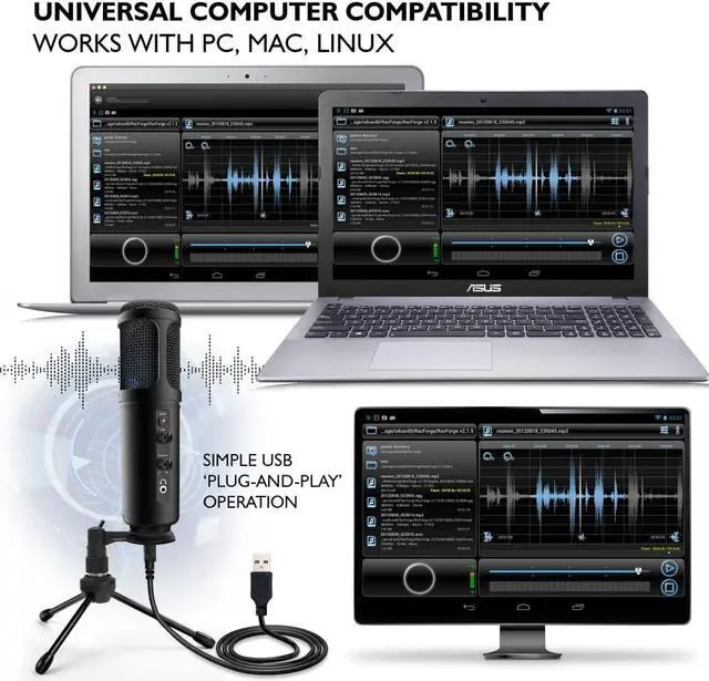 The portable broadcast microphone features freestanding placement on any desktop, counter, or table with the included detachable metal tripod mic stand mount. Easy to adjust and secure the angle position of the microphone. Ideal for everything from studio vocals to gaming, streaming, podcasting, singing, editing, and desk recording. Works with Windows PC, Mac, Linux operating systems. For home, office, and business use.
