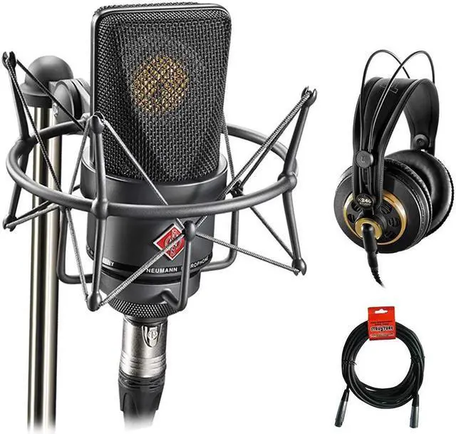 The black TLM 103 Large-Diaphragm Condenser Microphone from Neumann is a cardioid, directional microphone that features low self-noise and high sound pressure level transmission. The capsule, derived from that used in the Neumann U 87, has a cardioid pattern, is acoustically well-balanced, and provides great attenuation of signals from the rear. The TLM 103 is equipped with a large-diaphragm capsule with a cardioid pattern. By focusing on this pattern, the attenuation of unwanted rear sound has been optimized. Off-axis sounds are rendered naturally while isolation is increased. This also leads to a high feedback suppression when the microphone is used in live situations or where loudspeaker playback is a factor. The TLM 103 is addressed from the front. The K 103 large diaphragm capsule is based on the K 87, and has a flat frequency response up to about 5 kHz, and above that, a wide flat 4 dB presence boost. This bundle comes with a K 240 Studio headphones from AKG feature a semi-open circumaural design, and use patented Varimotion technology and extra-large transducers to deliver extremely precise, detailed sound. The headphones have a self-adjusting headband, as well as thick around-ear cushions for lasting comfort. The single-sided detachable straight cable resists tangles and can be easily replaced. Plus a 20' XLR-XLR cable. Box Contains Neumann TLM 103 Large-Diaphragm Condenser Microphone (Mono Set, Black) Neumann TLM 103 Large-Diaphragm Condenser Microphone (Black) Neumann EA-1 - Elastic Suspension for TLM103, 193 and M147 Studio Microphones (Nickel) 2-Year Warranty AKG K 240 Studio Professional Semi-Open Stereo Headphones Gold-Plated 1/4 Adapter Detachable Cable Limited 2-Year Warranty 20' XLR-XLR Cable Complete with 90-Days Warranty