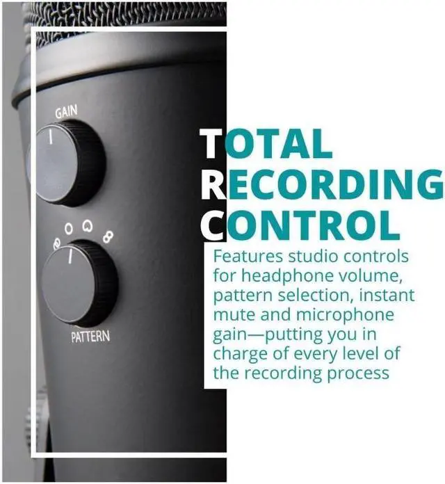 Total Recording Control with YetiYeti features studio controls for headphone volume, pattern selection, instant mute and microphone gainputting you in charge of every level of the recording process. If youre experiencing distortion or feedback while recording an especially loud sourcelike the deafening sound of an avalanchesimply adjust the microphone's sensitivity with the gain control. Or if you want to take a break in the middle of a podcast, use the instant mute button. The microphone comes equipped with a 3.5-millimeter headphone jack that allows you to listen to what you're recording in real-time, without latency delaysthat means no more hearing a note 3 seconds after you played it. You can adjust the volume of your headphones using the control on the front of the microphone.