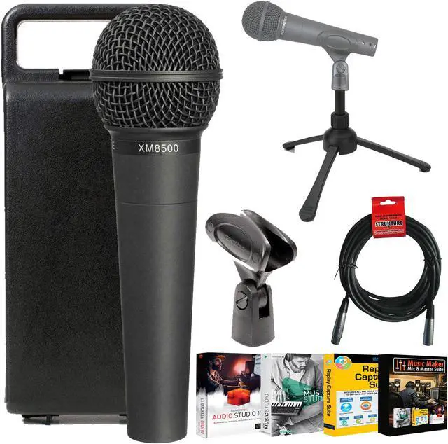 BEHRINGER XM8500 ULTRAVOICE DYNAMIC CARDIOID MICROPHONE + STRUKTURE XLR MICROPHONE CABLE MALE TO FEMALE 6FT MIC CABLE + ZOOM TPS-4 TABLETOP TRIPOD MICROPHONE STAND + MUSIC MAKER MIX AND MASTER SUITE SOFTWARE