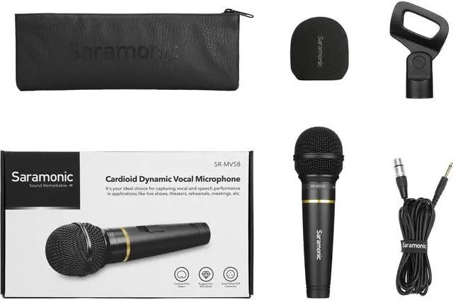 It includes a convenient 5/8" threaded microphone clip with a 3/8" adapter, facilitating seamless integration with various microphone stands. Additionally, the microphone package comes with a leatherette zippered carry case for secure transportation, a touch-fastener cable tie for organized setup, and a 16.4 -foot (5m) female XLR to 1/4" input cable for immediate connectivity. With a wide dynamic range and a sensitivity of -51dB, the SR-MV58 is adept at capturing the subtlest details in quieter vocal performances while also being robust enough to handle the high sound pressure levels of energetic musical acts without distortion.