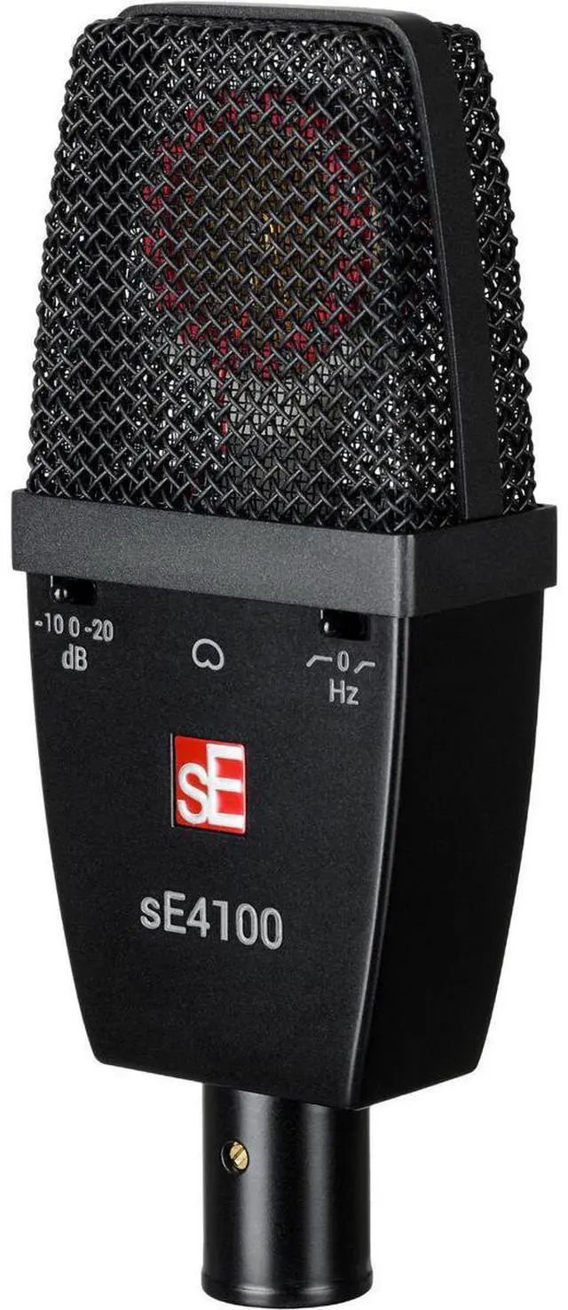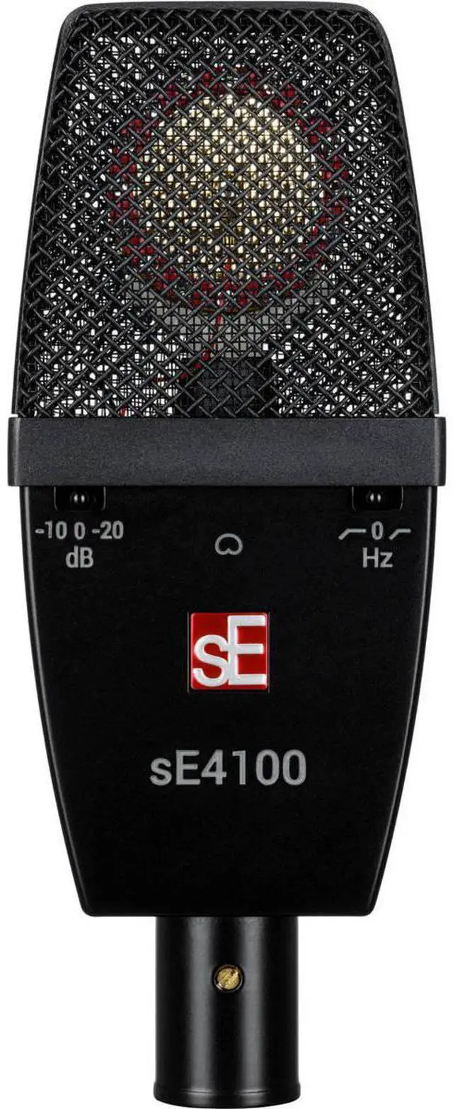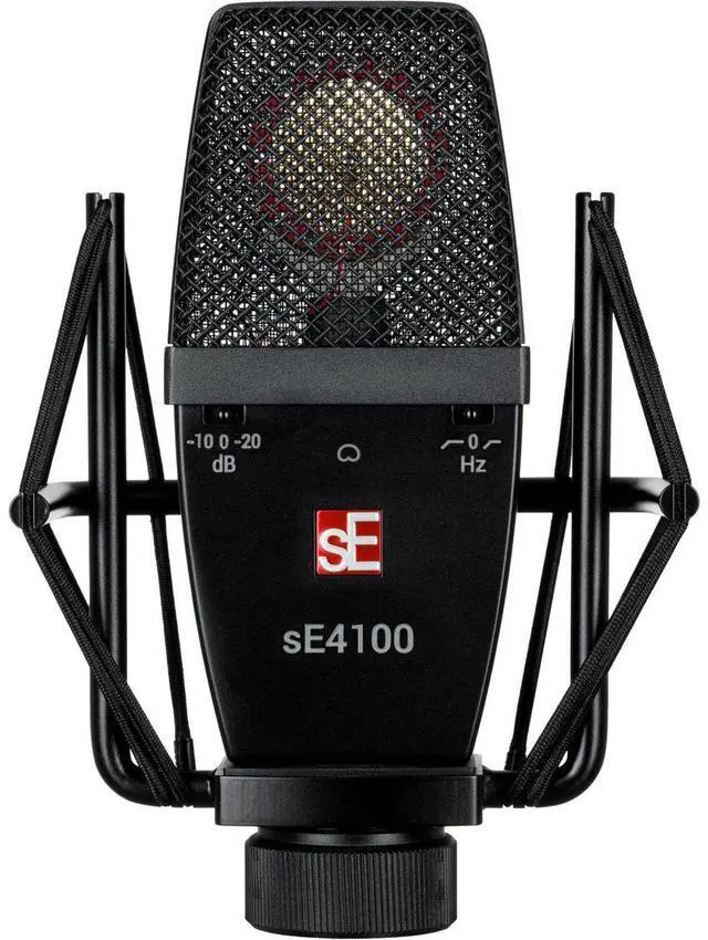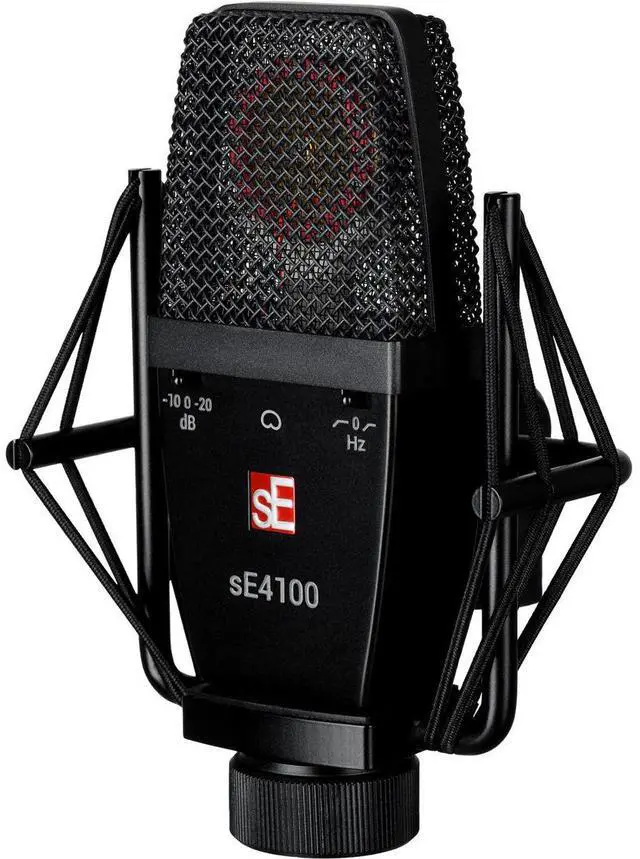 This provides the necessary extended dynamic range and roll-offs needed to fine-tune your sound at its source. Constructed with meticulous attention to detail, the sE4100 features a dent-proof die-cast all-metal housing, metal switches, a rugged spring steel wire mesh grille, and a premium finish. This microphone is built to withstand the rigors of touring and years of demanding studio use. The unique flat, round-edged chassis design and custom suspension mount allow the microphone to be centered within the shock, used flat against a drum head or guitar cabinet, and offer exceptional protection from low-end rumble and footfall noise.