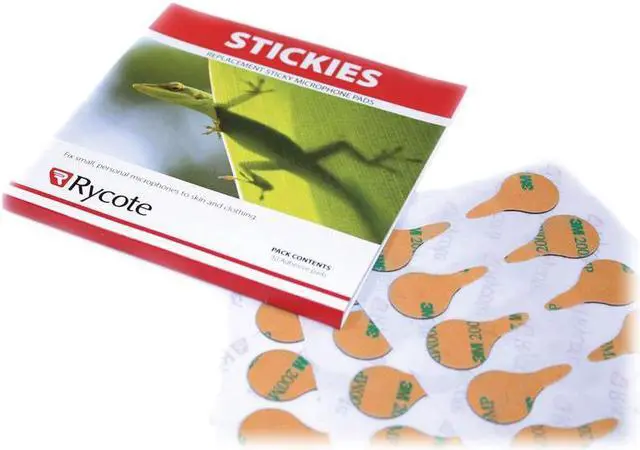Stickies are double-sided adhesive pads, used to affix small, personal microphones directly onto the skin or on top of clothing. The pads are sandwiched with a soft fabric to prevent the mount from creaking when the mic is attached. The materials used are hypoallergenic.