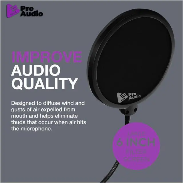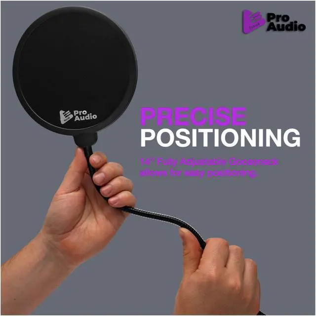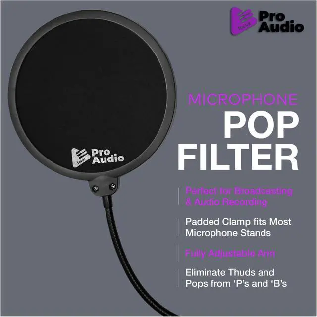 The Focus Pro Audio Pop Filter for Broadcasting and Recording Microphones is a guard used by amateurs and professionals to achieve clearer audio recordings by eliminating 'popping' sounds from P's and B's. It also keeps saliva from hitting the microphone. The included gooseneck clamp enables the filter to be placed in a variety of positions.An Inexpensive Way to Improve Audio Quality