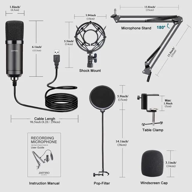 ? ?PROFESSIONAL MIC KIT? This condenser mic kit includes USB condenser microphone, suspension scissor arm, metal shock mount, double-layer pop filter and windscreen, studio mic is easy to install and use