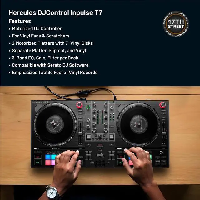 Authentic Vinyl-Style DJ Control: Experience true vinyl-style control with the Hercules DJControl Inpulse T7, featuring dual 7" motorized platters, authentic slipmats, and beatmatch light guides. Its pro mixer layout includes 3-band EQ, filters, FX paddles, and VU meters. Compatible with Serato DJ Lite & DJUCED, it’s perfect for mixing, scratching, and learning DJ skills.