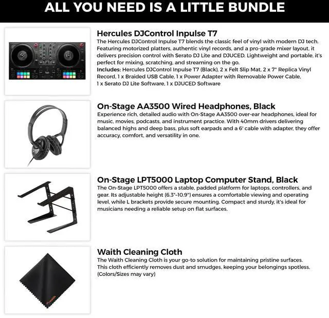 - Box Includes: 1 x Hercules DJControl Inpulse T7 (Black), 2 x Felt Slip Mat, 2 x 7" Replica Vinyl Record, 1 x Power Adapter with Removable Power Cable, 1 x Braided USB Cable, 1 x Serato DJ Lite Software License, 1 x DJUCED Software License, 1 x On-Stage AA3500 Accurate Audio Headphones, 1 x 3.5mm to 1/4" Adapter, 1 x On-Stage LPT5000 Laptop Stand, 2 x Top L Brackets, 2 x Bottom L Brackets, 2 x Stabilizer Bars, 4 x Screw Knobs, 1 x Waith Cleaning Cloth