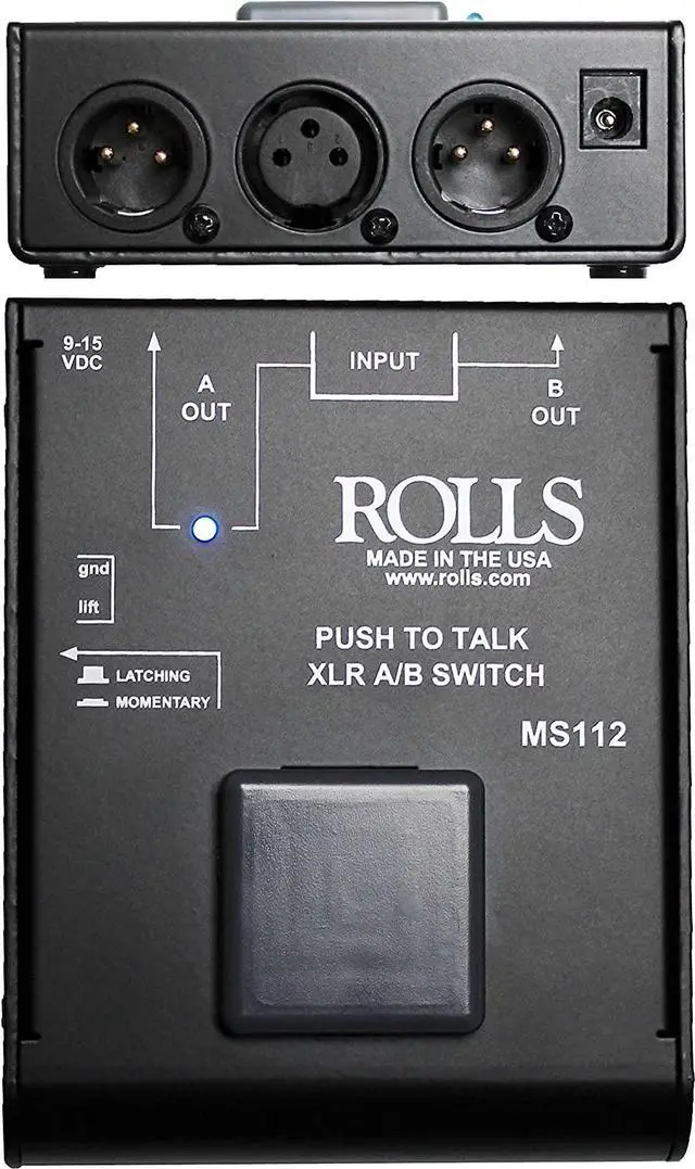 The MS112 is an XLR switching device. The MS112 will allow you to Push To Talk or mute an XLR signal with a selectable momentary or latching switch configuration. LED indicator for monitoring where the XLR signal is being sent. A mic or line level XLR is plugged into the input, and output is sent to the A or B outputs in a momentary or latching configuration. Quiet switching for both +48V phantom power microphones or dynamic microphones.