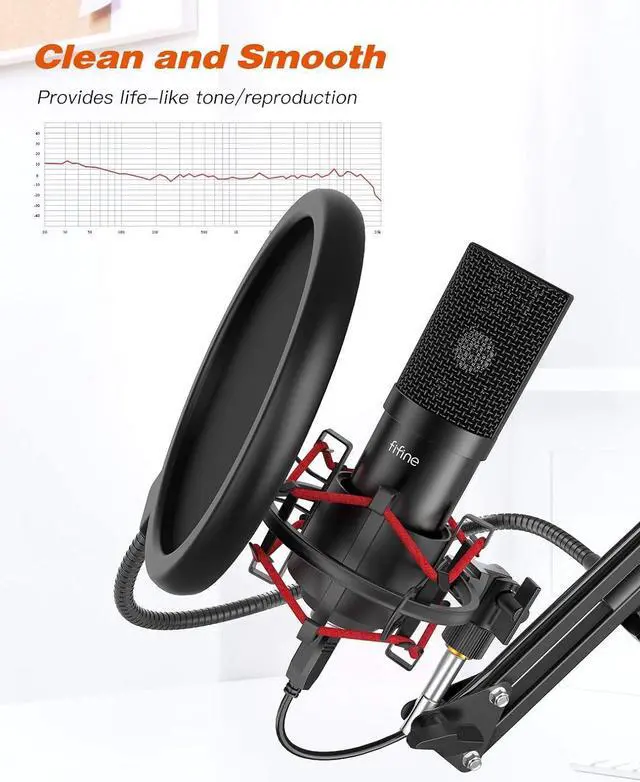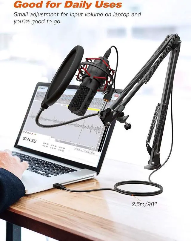 Dual Layer Pop FilterThe pop filter with sturdy gooseneck reduces plosive sounds hitting the desk mic, which makes your vocal or instrument sound silky smooth without muffling it or distorting it in anyway. The podcast usb microphone kit saves you a lot of time editing of pops and noises on your audio files. And it helps to keep moisture off the mic, which preserves your equipment.