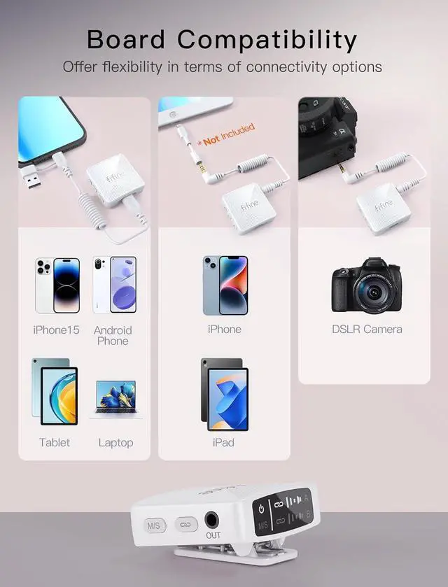 Warm Tip: 1) If there is a lightning port on your iPhone/iPad, connect the included 3.5 mm TRRS to 3.5 mm TRS cable with a lightning adapter, and plug them into your device, after then connect your device to receiver. 2) FIFINE wireless microphone M9 is compatible with Android phone/tablet (Type-C port), iphone15 Series, iphone 16 Series, ipad with Type-C port, DSLR Camera.