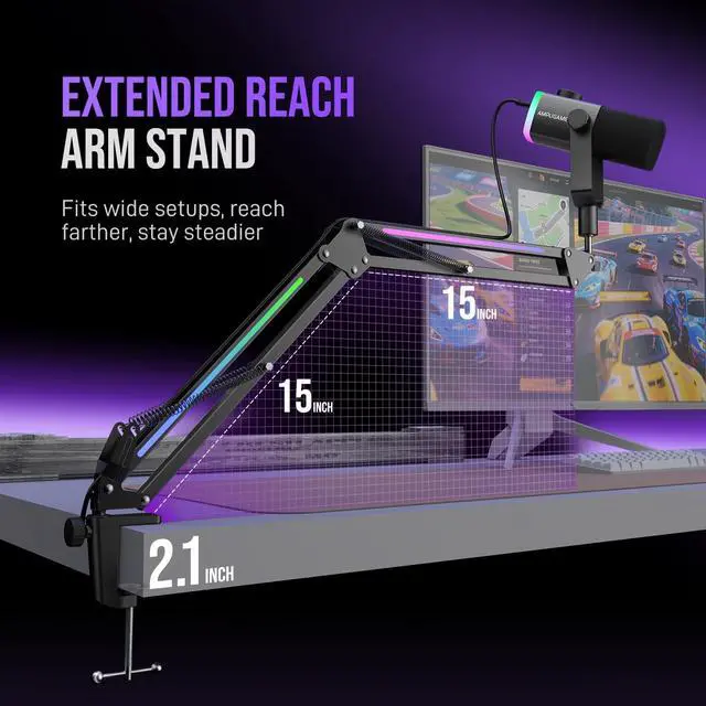 [Vibrant RGB System] Experience immersive 240+ RGB combos of mic and boom arm . Select beat modes that the computer microphone pulses to horror game soundtracks, dialing up chilling tension. The arm stand glowing pair with the boom mic lighting enhances explosions via flowing modes or maintains strategic focus via cool tones by controlling RGB button.
