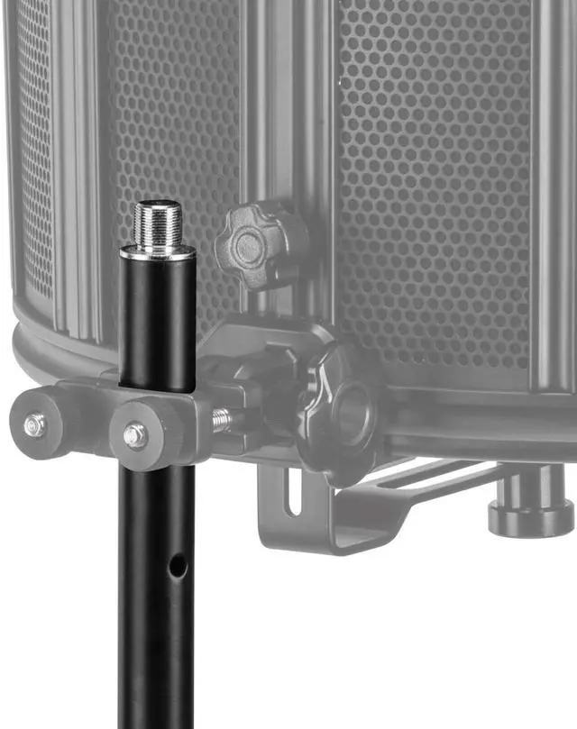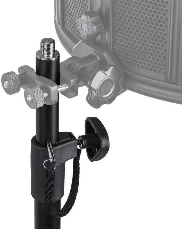 Give your studio microphone and a reflection filter proper support using the H&ATripod Stand for Reflection Filters & Mics. Featuring two sections, three folding legs, and a 5/8"-27 stud on the top, this strong stand not only can holdyour sound filter and studio microphone but also can accommodate pop filters andother accessories. For securing the height and the extended legs, it has two locking knobs, and to prevent accidental slide-down and damage to your equipment, the top section has security holes and a safety pin. For a slip-free operation on any surface, the legs also feature rubber feet.