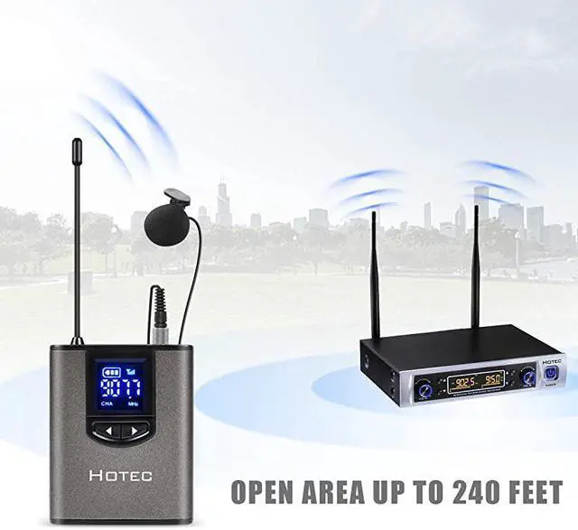 *****WORKING FREQUENCY: The system has 64 selectable UHF frequencies, 32 for each Transmitter, less prone to electric appliance interference and offers stable signal transmission with strong anti-interference ability. Operating range can be up to 100 feet line of sight. Press the frequency change button in the receiver to select the appropriate channel in case there is any interference.