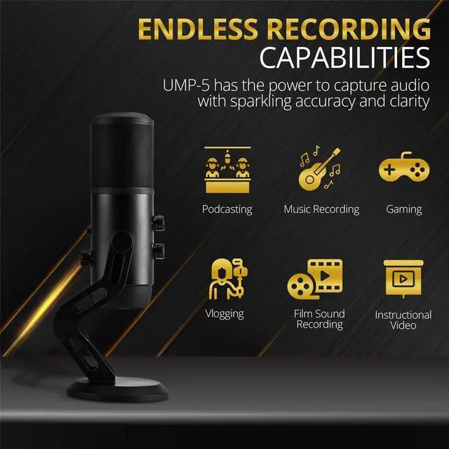 The Gig: Podcasting, acoustic instrument recording, gaming, vlogging, film sound recording or instructional video conferencing. This microphone can do it all. Amazing VersatilityWith a USB-C output, the versatile multi-polar pattern mic connects directly to a computer through a USB-A port and utilizes phantom power for lightning-fast broadcast quality recording. Whether you're in a studio, live on set or at home just plug it in and record! Add Plug-and-Play to a Mac or Windows USB port, plus an internal A/D converter, 16-bit capture rate, and up to 48kHz resolution for a natural sound delivery to the host computer. The Swiss Army Knife of MicsThe UMP-5 has direct access to Gain Control, Mute, Headphone Volume Control and 5 Polar Pattern Select, giving you more control while recording. Because adjustments happen in the moment, you save time in post-production. Recording live is a breeze and a pleasure. Recording made easy. The UMP-5 is ready to go with an included tabletop mic stand. Convenient and stable, it is easy to set up and fold down for storage. The mic stand suspension eliminates annoying bumps, knocks or noises when recording.