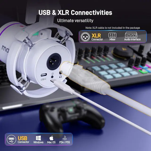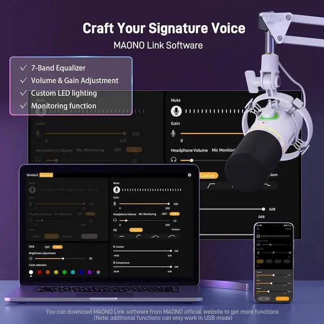 Advanced Software Control: MAONO Link software takes your audio customization to the next level, allowing you to adjust various parameters and optimize your sound effortlessly setting the perfect vocal tone. And you can turn on/off the RGB light or switch in 9 different colors, also supports EQ, limiter, and compressor adjustment in USB mode. (Software features are only available in USB mode)