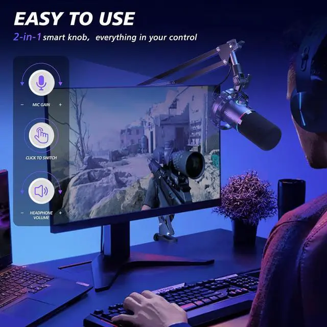 Easy Plug-and-Play Setup: Everything is in your control, simply connect the microphone to your computer via USB and start recording instantly. No additional drivers or complicated setups are required. The podcast microphone has a 2-in-1 smart knob to adjust the mic gain and headphone volume, the one-click mute key with LED indicator helps you to instantly mute the mic, and real-time monitoring of 3.5 mm headphone jack monitor output voice as desired by recording professionals