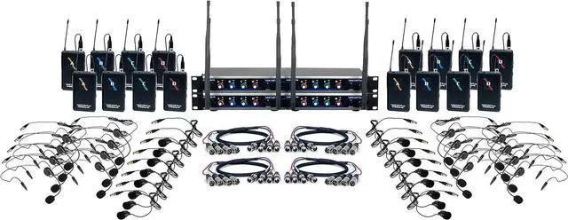 1. Sixteen wireless Body packs with headsets and lapel mics each channel has a dedicated XLR output and volume control