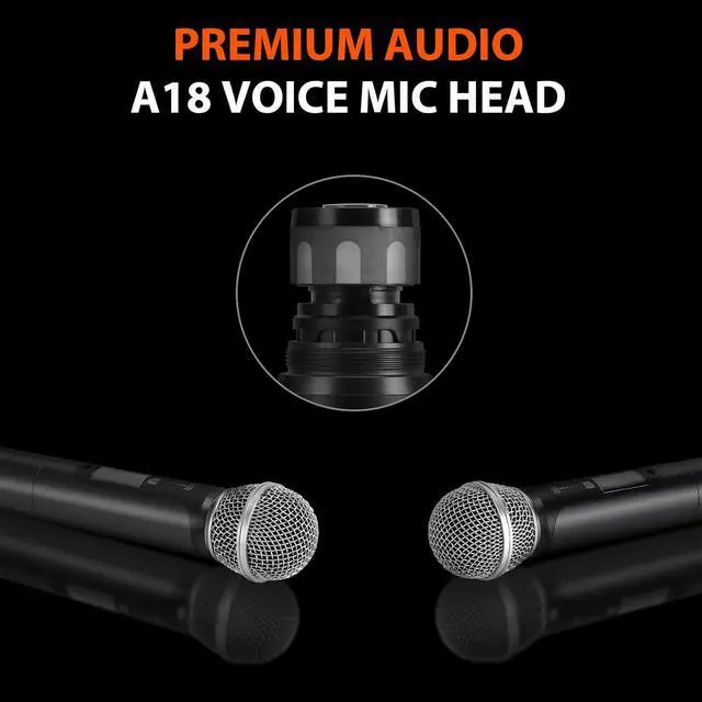 What you get: Receiver,2 handheld microphones, power adapter, 1/4 audio cable, 2 Antenna