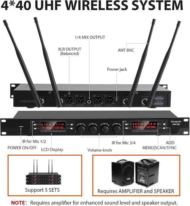 innopow 4 Channel Wireless Microphones System, Quad UHF Cordless Mic Set,4 * 40 Groups Metal Handheld Dynamic, Auto Scan, Long Range 200-300Ft,16 Hours Use for Church,Singing Bands (WM500)