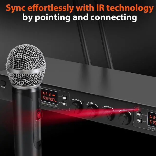 Offer 100 selectable frequencies on each channel, mic A(536.57-561.32), mic B(562.37-587.12). We update each microphone frequency from 40 to 100, which can more effectively avoid interference