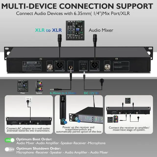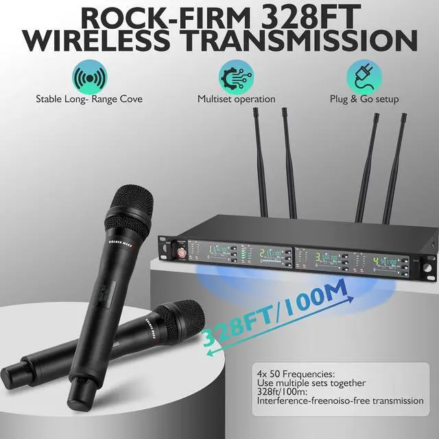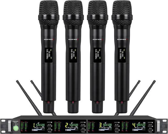 : Includes 1 quad-channel wireless metal receiver, 4 UHF wireless handheld microphones, 1 1/4-inch audio cable, 1 power adapter, 4 antennas, 4 anti-roll rings, 8 AA batteries (16 hours of continuous use), and 1 user manual.