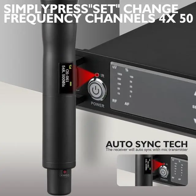 : This UHF wireless karaoke microphone system utilizes an automatic scanning function to quickly identify and synchronize frequencies with minimal interference. This advanced wireless microphone and system feature enhances anti-interference capabilities and reduces interference between channels. Furthermore, the system includes a locking function to lock onto a selected frequency. Four x 50 selectable UHF frequencies support simultaneous multi-device operation by up to 16 transmitters.