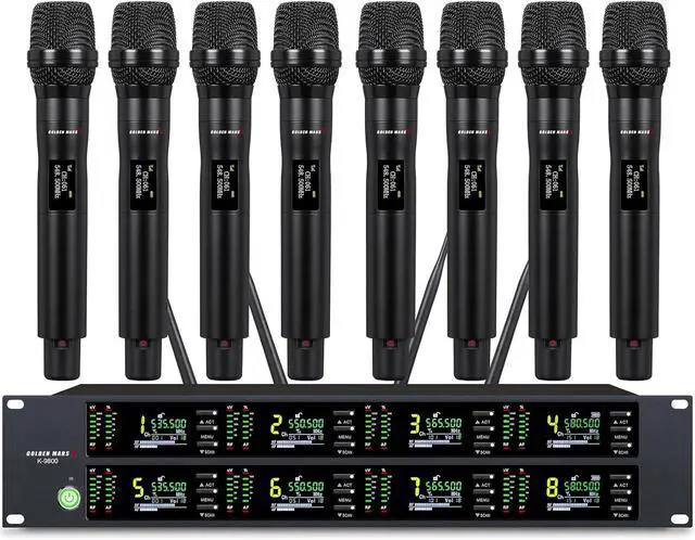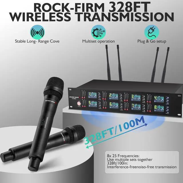 : Includes 1 quad-channel wireless metal receiver, 4 UHF wireless handheld microphones, 1 1/4-inch audio cable, 1 power adapter, 4 antennas, 4 anti-roll rings, 8 AA batteries (16 hours of continuous use), and 1 user manual.