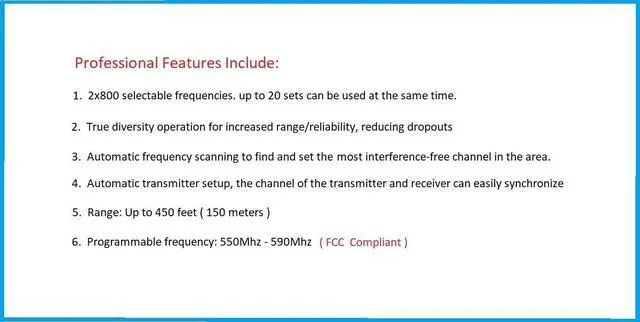 1. 800 Selectable frequencies on each channel, up to 20 sets can be used at same time