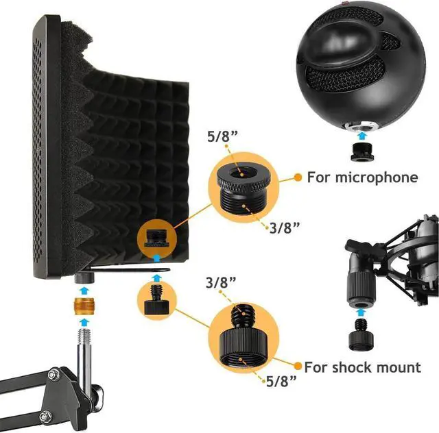 Package Included - 1 x Microphone Isolation Cover, 1 x Golden Adapter 3/8 female to 5/8 male, 1 x Black Adapter 3/8 female to 5/8 male, 2 x Black Adapter 5/8 female to 3/8 male, 1 x Black Adapter 3/8 female to 3/8 male.