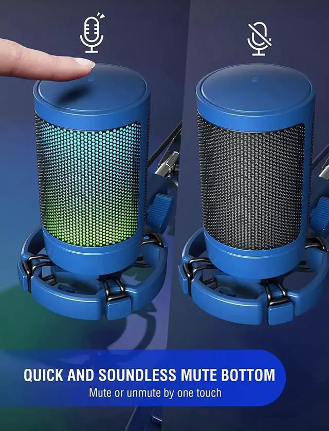 Vivid RGB & Quick Mute-Polished blue gaming mic body with automatic changing RGB, matching flowing rainbow light computer build, shows your calm and luxury of gamer device. Touch the mute button on the top to quickly mute, and the RGB will be turned off following it, reminding you of working status.