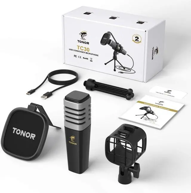 What You Get: 1 x condenser microphone, 1 x shock mount, 1 x foldable mic tripod, 1 x pop filter, 1 x USB Type-C to USB-A 2.0 Cable, 1 x manual. Note: It is compatible with Macs, PCs, PS4 and iPad (an adapter is required), not compatible with Phones and Xbox.