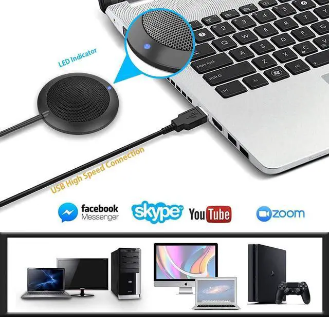 Conference USB Microphone, Computer Desktop Mic with LED Indicator, Plug & Play Omnidirectional Condenser PC Laptop Mics for Online Meeting, Class, Skype, Recording, Zoom, (No Speakers Included)