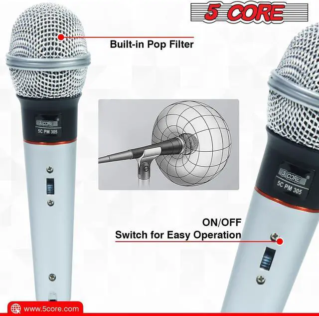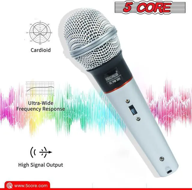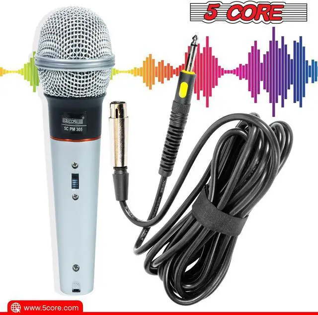 Dynamic Karaoke Mic: 5 Core Cardioid dynamic microphone with XLR cord; ideal for live situations needing noise cancellation; great for presentations; weddings; conferences; places of worship; interviews; and solo performance.