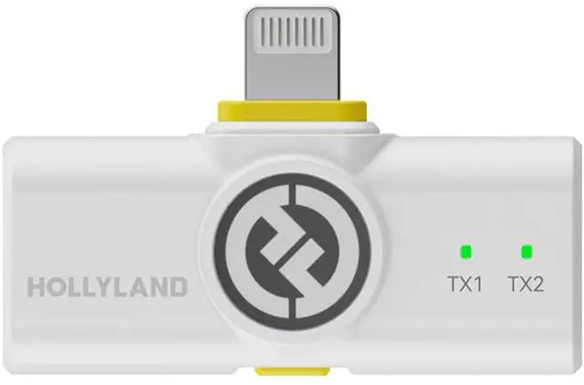 Hollyland LARK M2 LIGHTNING 2-Person Wireless Microphone System with Lightning Connector 2.4 GHz (Ivory White)Record up to two people in mobile journalism or content creation applications using this ivory white, 2.4 GHz LARK M2 DUO Wireless Microphone System with Lightning Connector from Hollyland. The system includes two transmitters with built-in omnidirectional microphones and dual-interface mesh, a plug-in Lightning receiver, and a charging case. Magnetic back clips and silicone necklace cases make attaching your transmitters to your talent a breeze.
