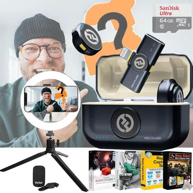 HOLLYLAND LARK M2 WIRELESS LAVALIER MICROPHONE WITH LIGHTNING PLUG (DUO,SHINE CHARCOAL) + VIVITAR 3 IN 1 DESKTOP STAND WITH 2 RING LIGHTS & PHONE CRADLE PC102 + MUSIC MAKER MIX AND MASTER SUITE SOFTWARE