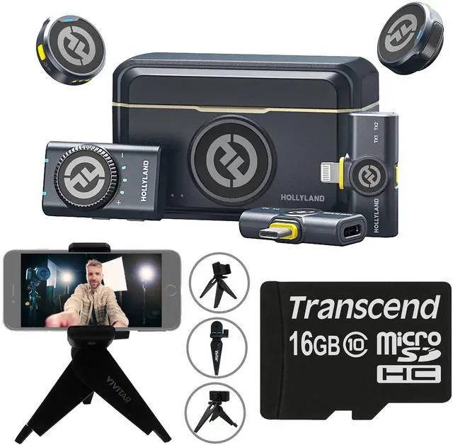 HOLLYLAND LARK M2 COMBO 2-PERSON WIRELESS COMBO MICROPHONE SYSTEM 2.4 GHZ (BLACK) + VIVITAR COMPACT SELFIE VIDEO TRIPOD + TRANSCEND 16GB MICROSD MEMORY CARD Hollyland LARK M2 COMBO 2-Person Wireless Combo Microphone SystemRecord up to two people in mobile journalism or content creation applications using this, LARK M2 DUO Wireless Combo Microphone System. The system includes two transmitters with built-in omnidirectional microphones and dual-interface mesh, three different receivers, and a charging case. Magnetic back clips and silicone necklace cases make attaching your transmitters to your talent a breeze. Various adapter cables and an integrated camera shoe mount ensure wide device compatibility.
