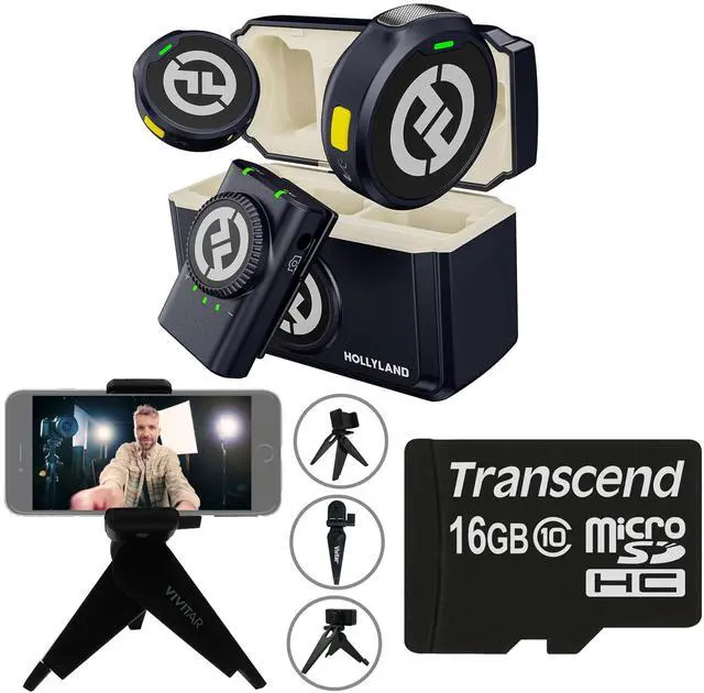 HOLLYLAND LARK M2 DUO 2-PERSON WIRELESS CAMERA-MOUNT MICROPHONE SYSTEM - UNIVERSAL COMPATIBLE (2.4 GHZ, SHINE CHARCOAL) + VIVITAR COMPACT SELFIE VIDEO TRIPOD + 16GB MICROSD MEMORY CARD