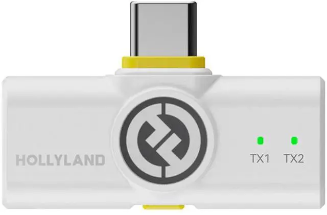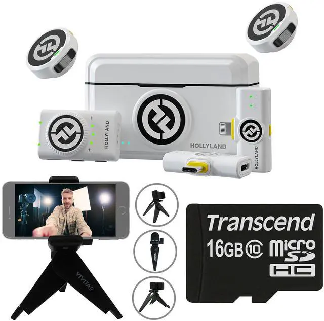 HOLLYLAND LARK M2 DUO 2-PERSON WIRELESS COMBO MICROPHONE SYSTEM (2.4 GHZ, IVORY WHITE) WITH COMPACT SELFIE VIDEO TRIPOD AND 16GB MICROSD MEMORY CARD